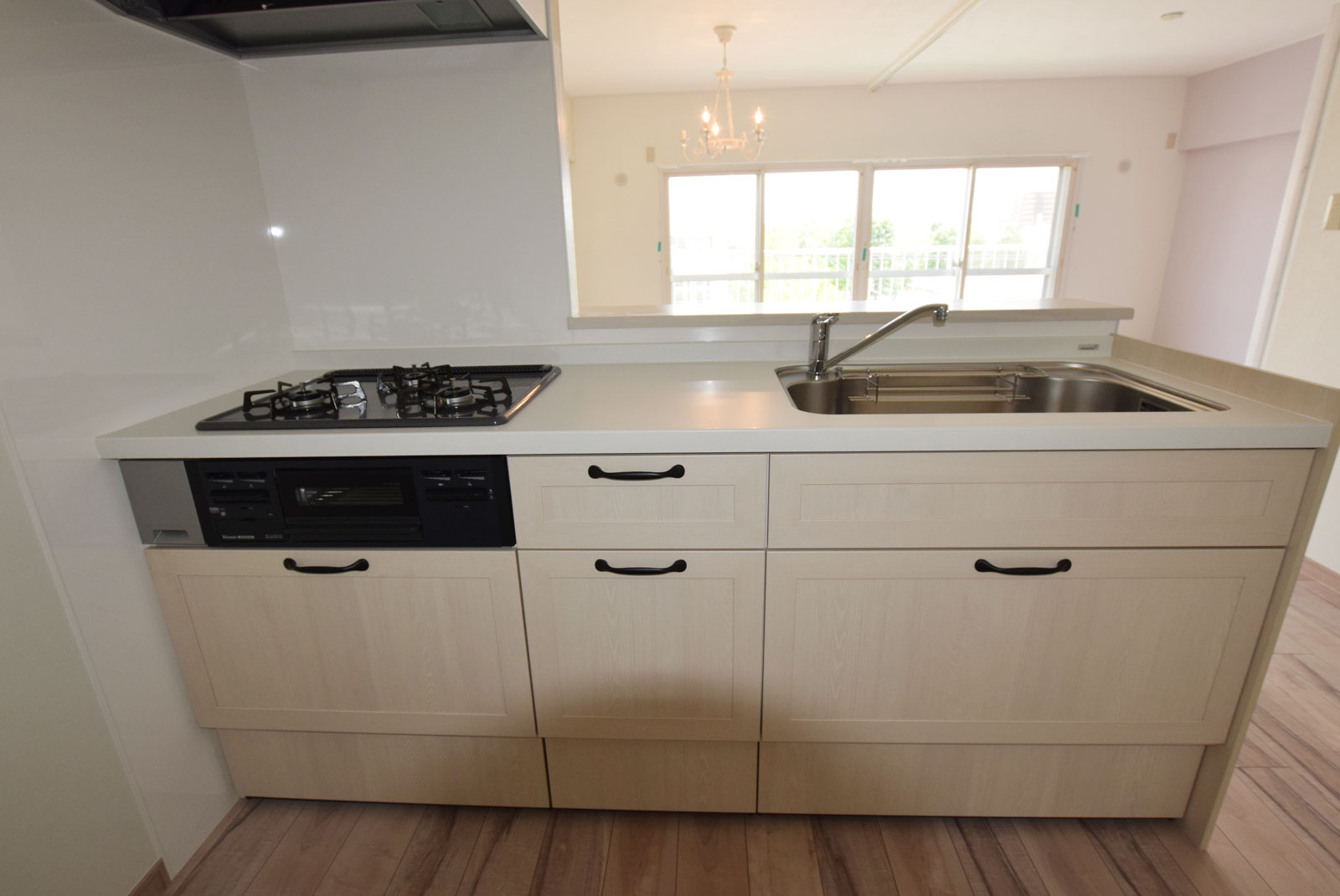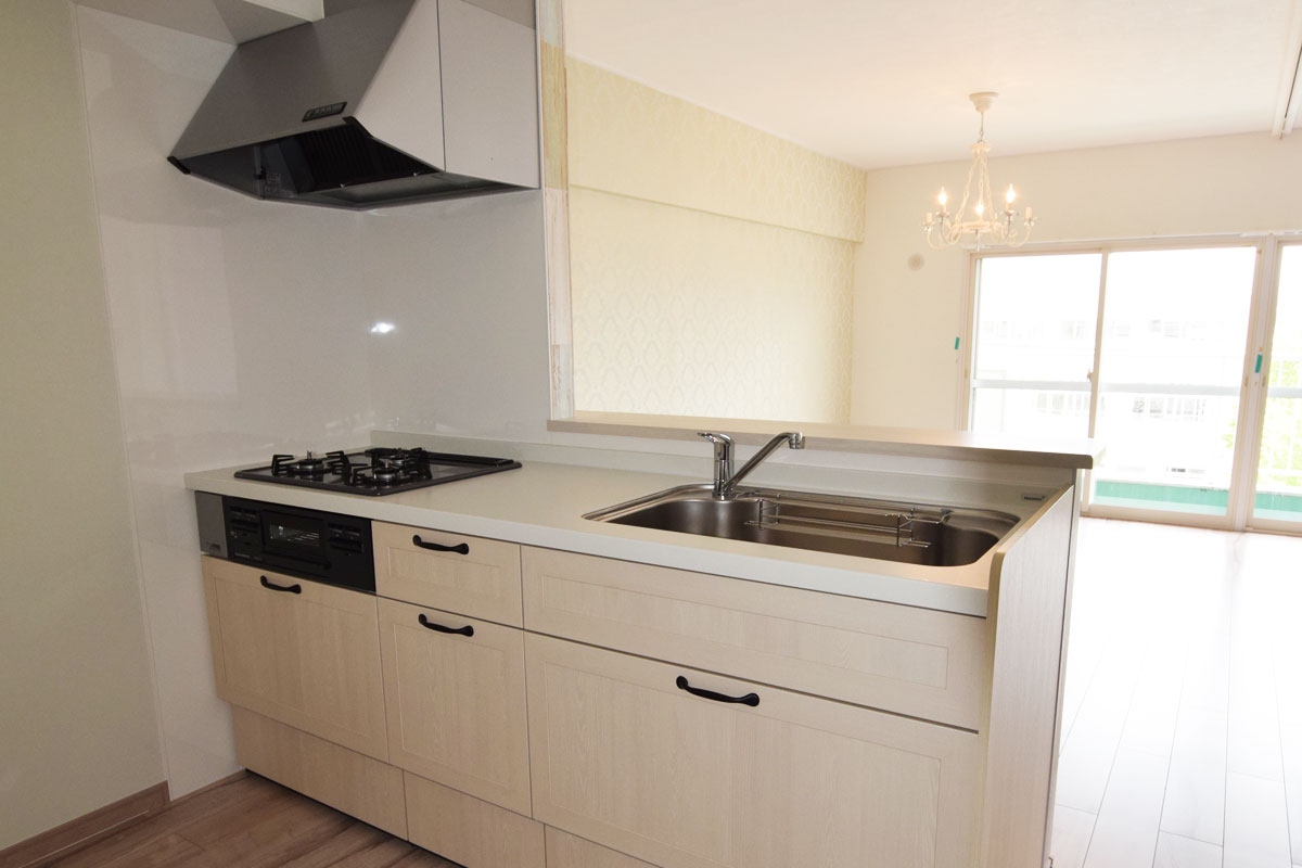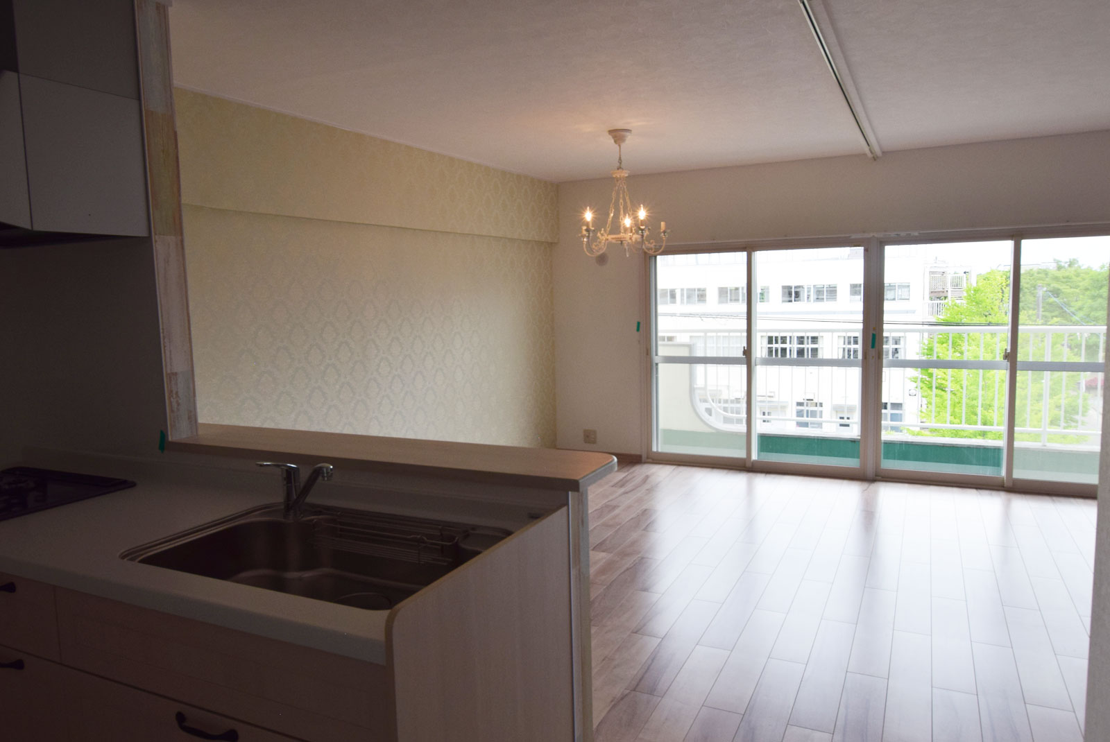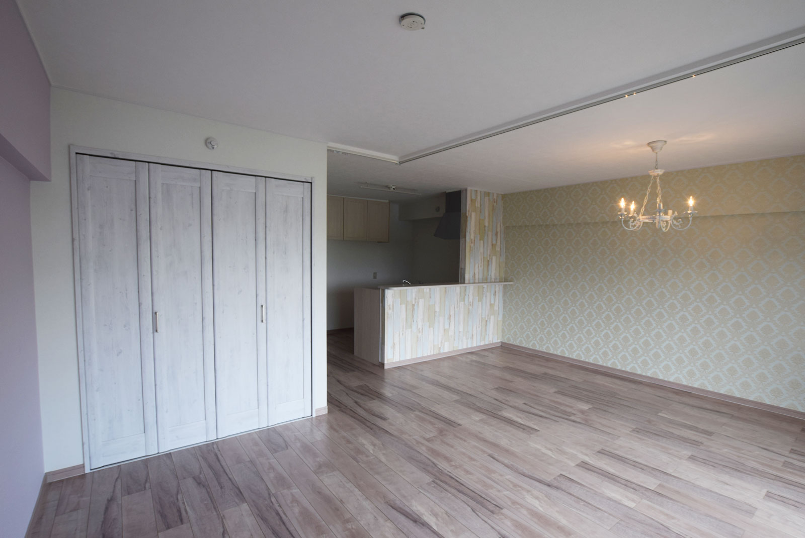 もともと3部屋あったところの壁を取り払い、広いLDKに間取りを変更しました。 お子様もたくさん遊べる空間になったと思います。中心にあるシャンデリアがとても印象的で、お部屋全体をエレガントな雰囲気に演出してくれています。