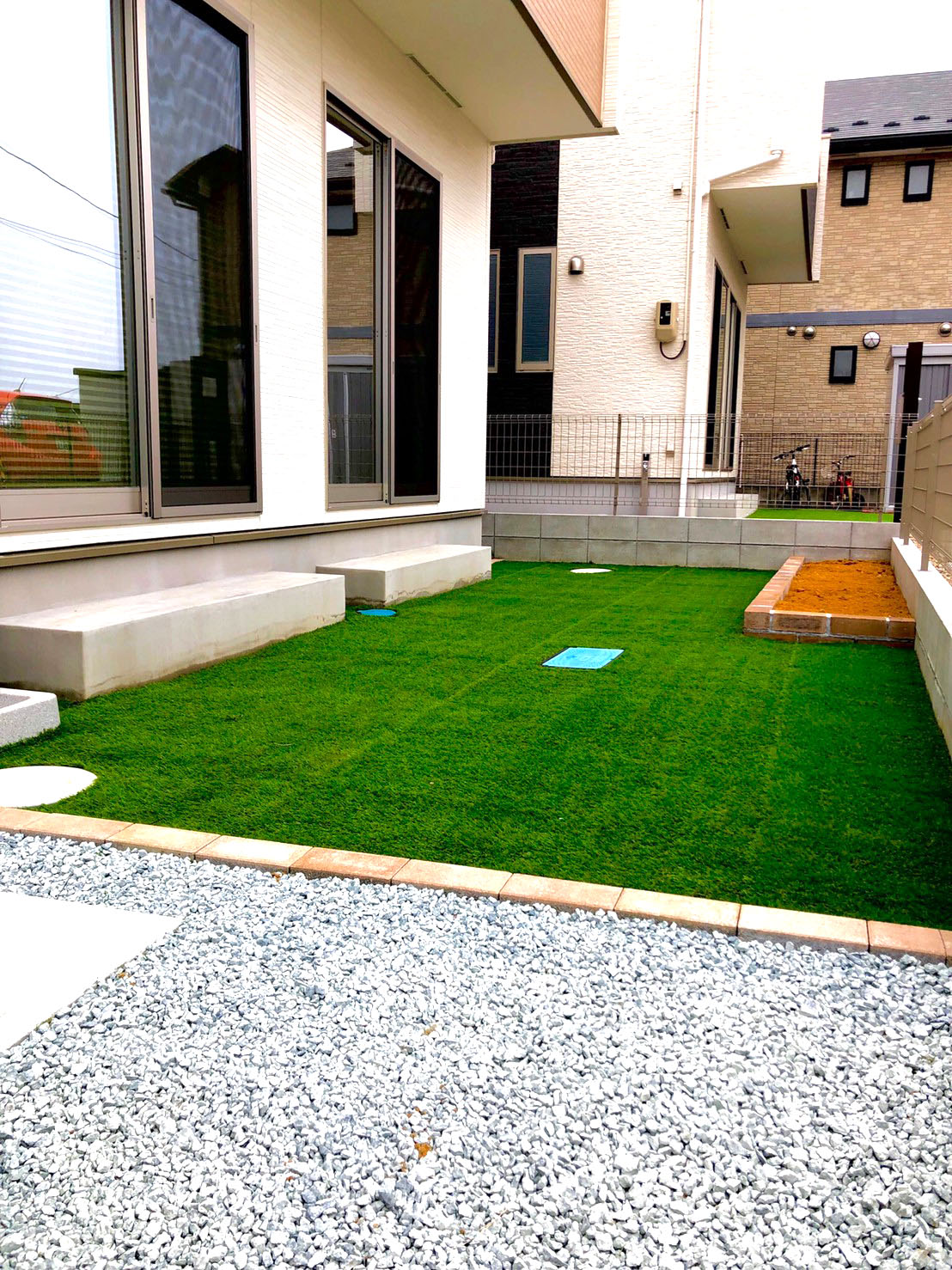 屋内、屋外と様々な工事をさせて頂きました。お庭の花壇の造作、その周辺の人工芝が非常に良いアクセントとなりました!
