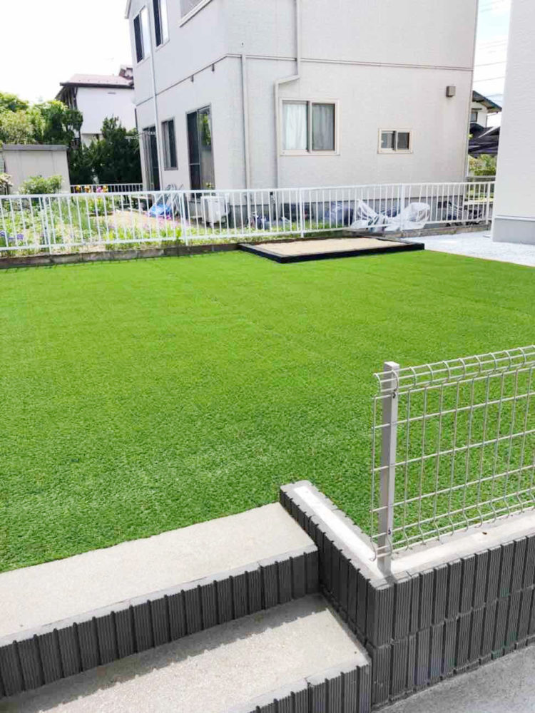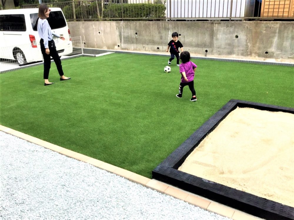 お庭が綺麗になると、家全体がより一層引き立って見えて、満足しています。庭の砂場で遊ぶ子供の姿、色鮮やかな人工芝に寝ころびゴロゴロ~♪する姿は、映えます!!