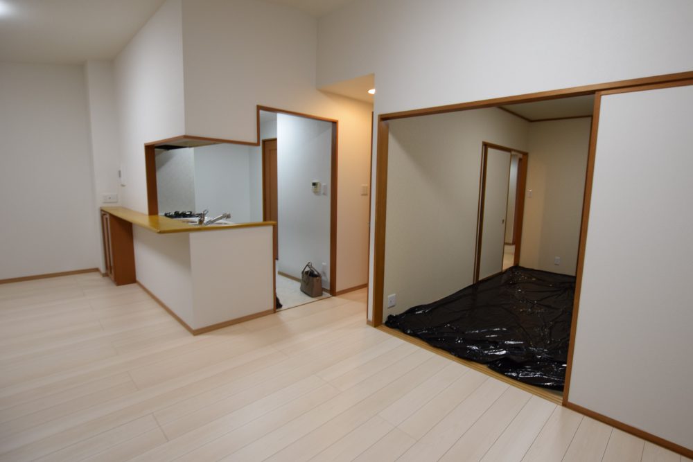 内装(クロス貼り替え、フローリング貼り替え)、間取り変更(3LDK→1LDK)、キッチン交換、洗面化粧台交換、浴室交換(サイズアップ)、トイレ交換 |