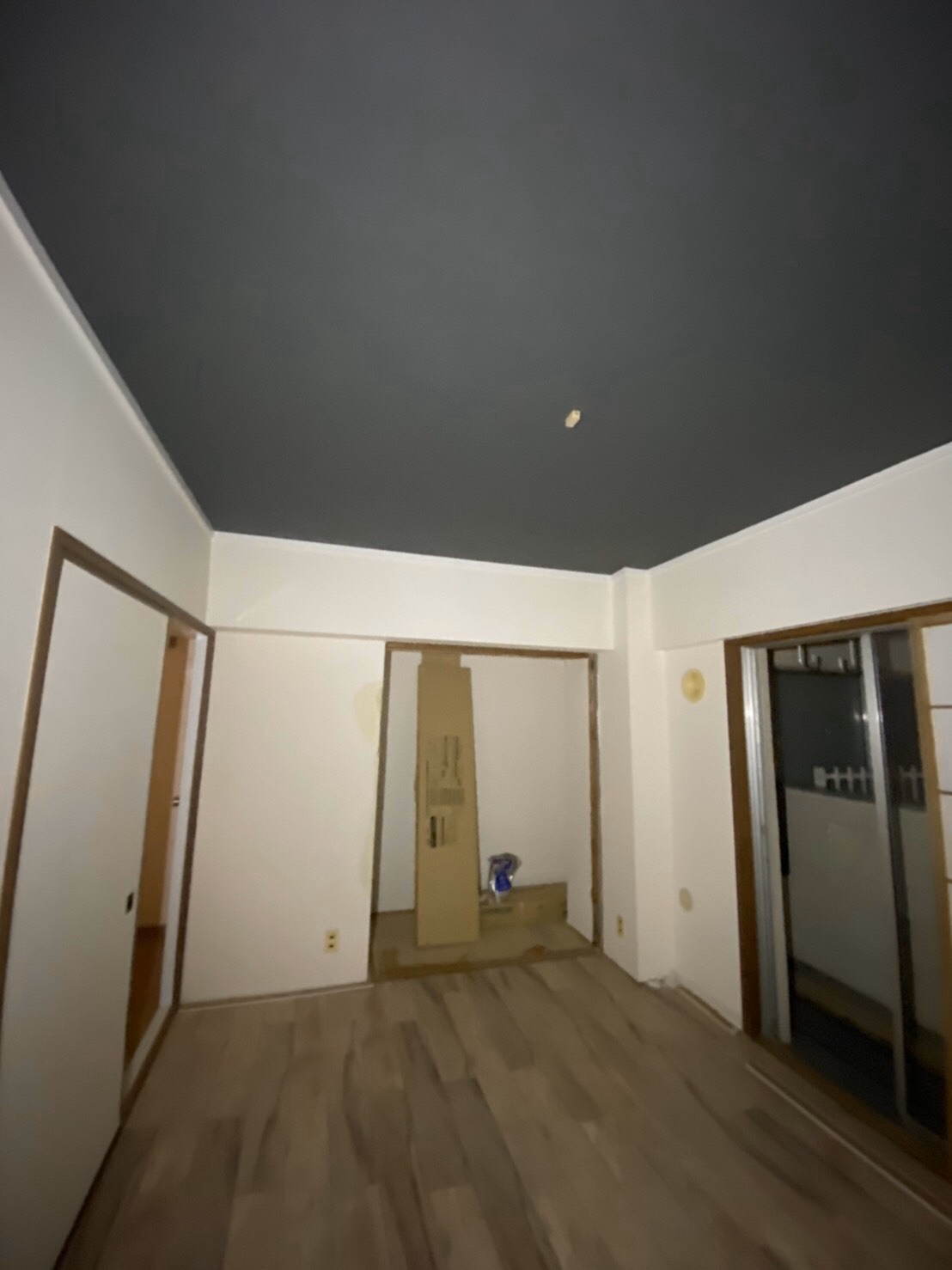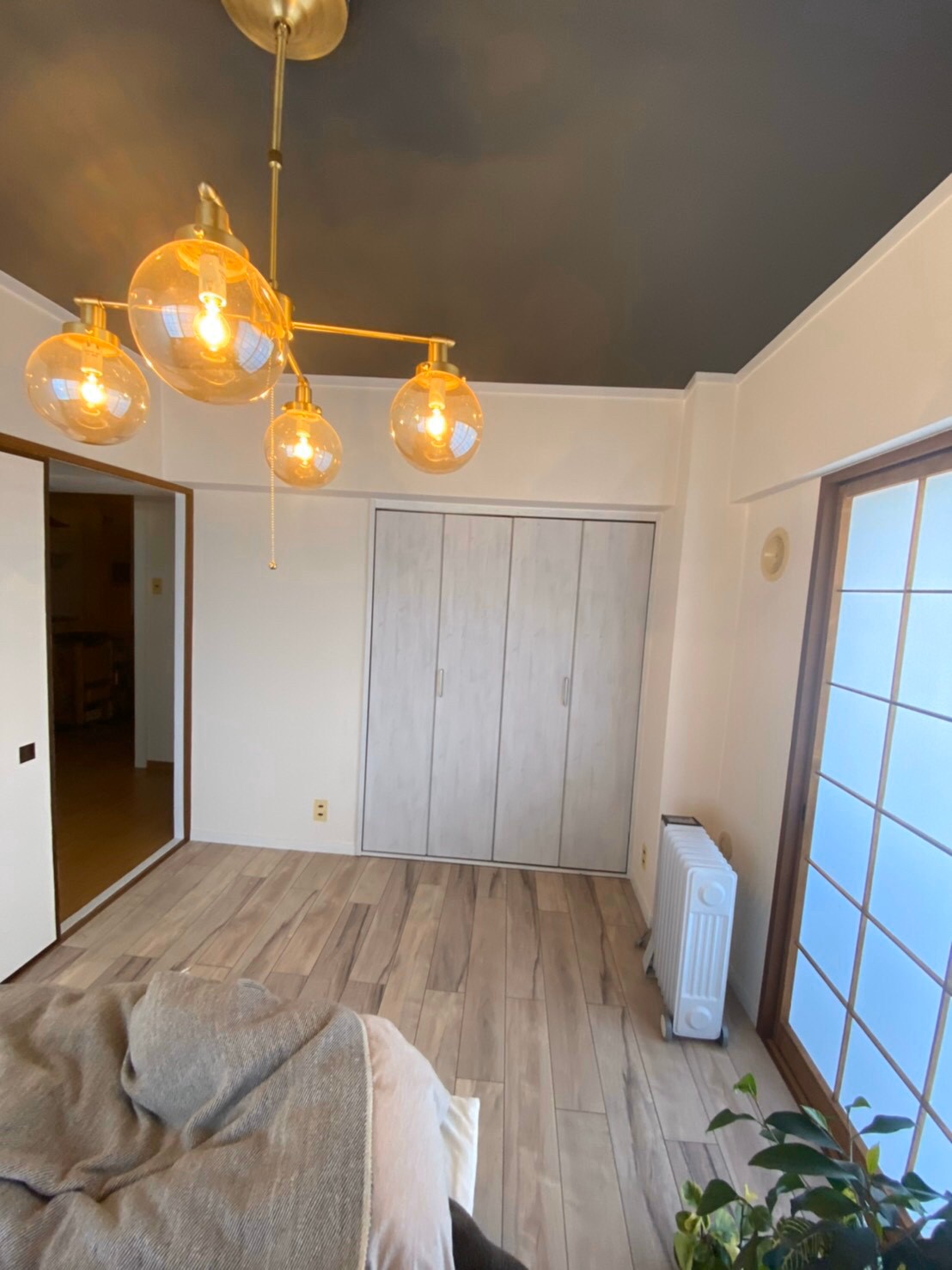 和室から洋室へのリフォームで、障子は生かしたまま、床・ドアは洋風へ…と挑戦的な組み合わせでしたが、見事に成功しましたね!天井のアクセントクロスも映えて、インスタに載せたいおしゃれなお部屋になりました。