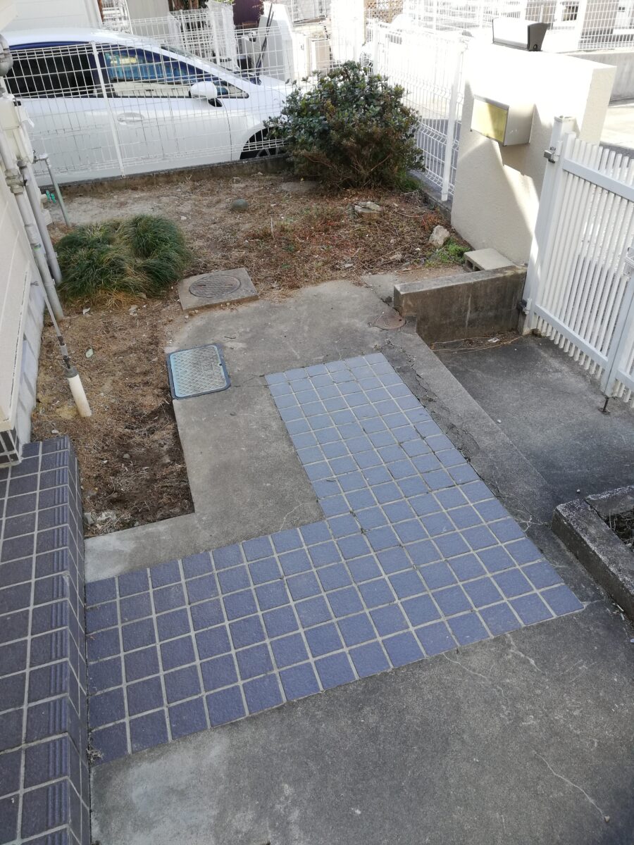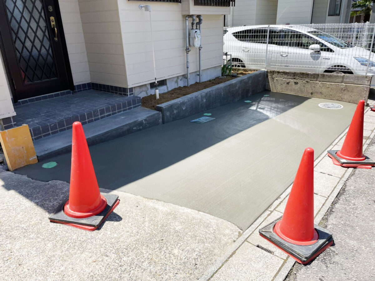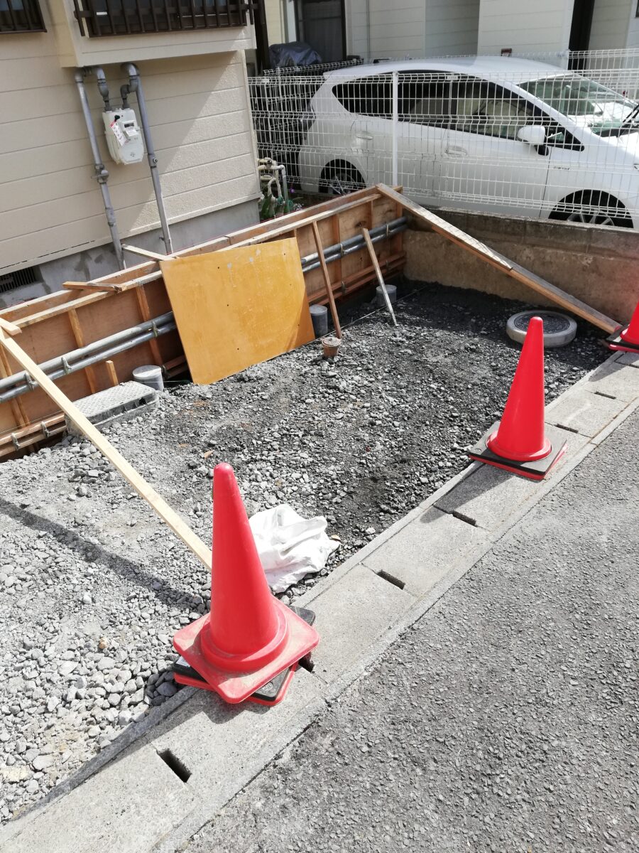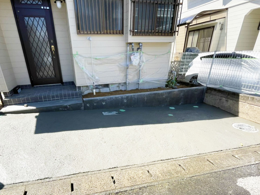 不動産ご契約時から「駐車場を拡張したい」とのご要望で、既存門柱やフェンス等を解体・撤去し、ガス・水道等のメーターや枡を接続する道路面の高さまで切り下げました。その後、配筋・土間コンクリート打ちをして表面は刷毛仕上げ。お客様の強いご希望にて、建物土留めについてはCBではなくコンクリートにて打設しました。昔ながらの門構えから、現在主流である、接道面が駐車場である作りへと様変わりに成功。住みやすさが格段に向上し、やってよかった工事だと思います。