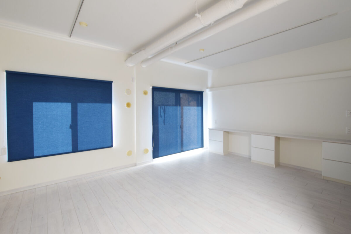 また、線路沿いの物件ということもあり、内窓を設置。遮音性に加えて断熱性能もアップしたため、カーテンの代わりにロールスクリーンを取り付けました。好きな色がアクセントになり、真っ白なリビングに鮮やかな青色が映えています。暖色の間接照明を壁面に埋め込み、温かな光がリラックス効果を演出。居心地のいいリビングを創り出せたことと思います。